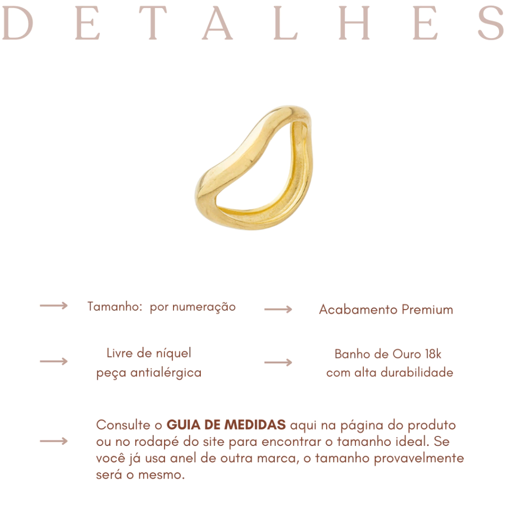 | DESCRIÇÃO TÉCNICA: - Anel feminino com onda delicada. - Consulte o GUIA DE MEDIDAS aqui na página do produto ou no rodapé do site para encontrar o tamanho ideal. Se você já usa anel de outra marca, o tamanho provavelmente será o mesmo. - Composição: banho de ouro 18K. |