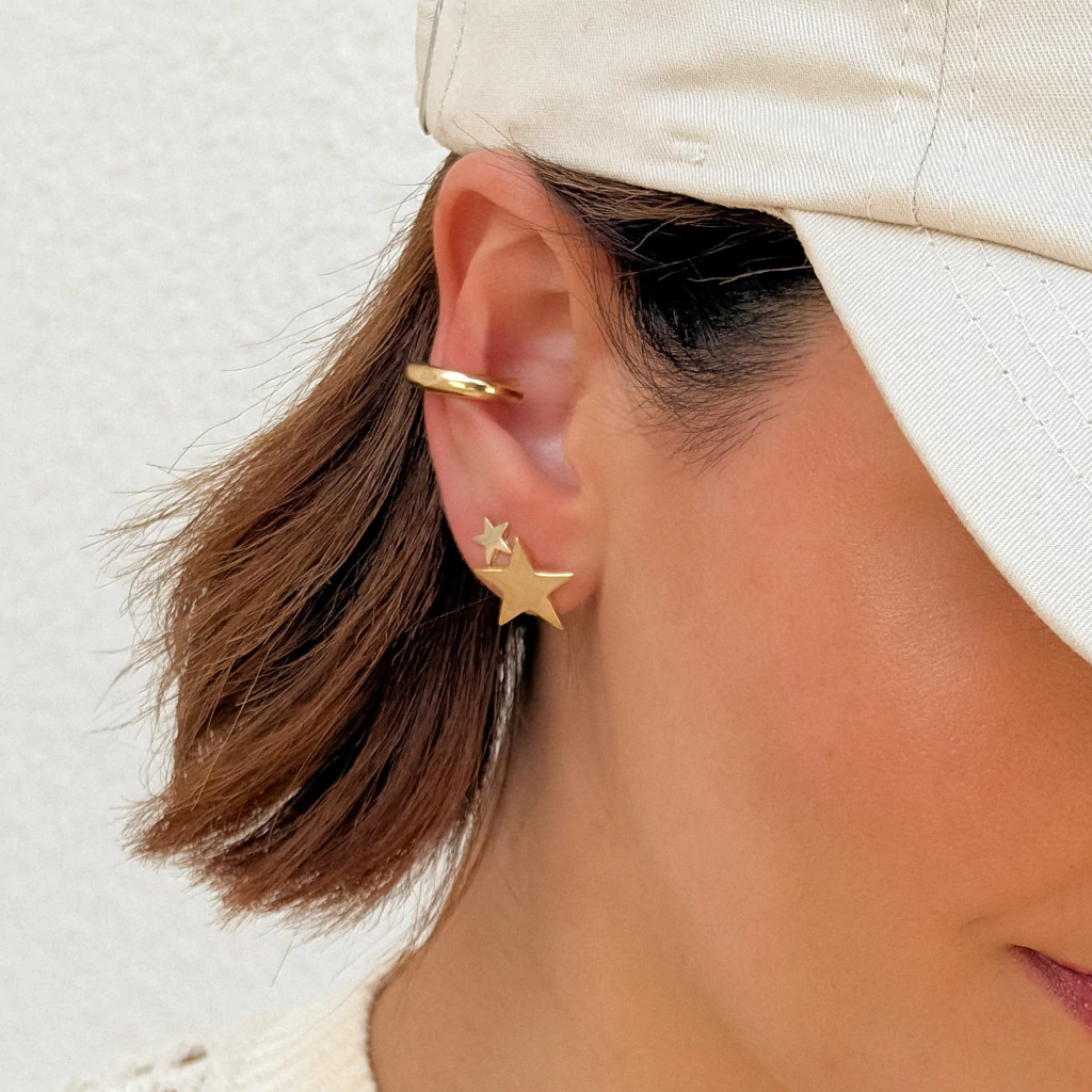 | DESCRIÇÃO TÉCNICA: - Brinco feminino liso, em formato de estrela. - Tamanho: 1,5 cm. - Peso do par: 1,5 grama. - Composição: banho de Ouro 18k. |