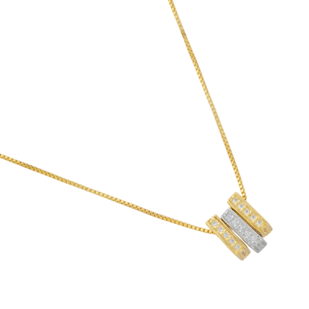 | DESCRIÇÃO TÉCNICA: - Colar feminino em mix de banhos, com pingentes quadrados cravejados com zircônia. - Tamanho: 45 cm de comprimento + 5 de extensor e 1 cm do pingente. - Composição: banho de ouro 18K e Ródio Branco. |
